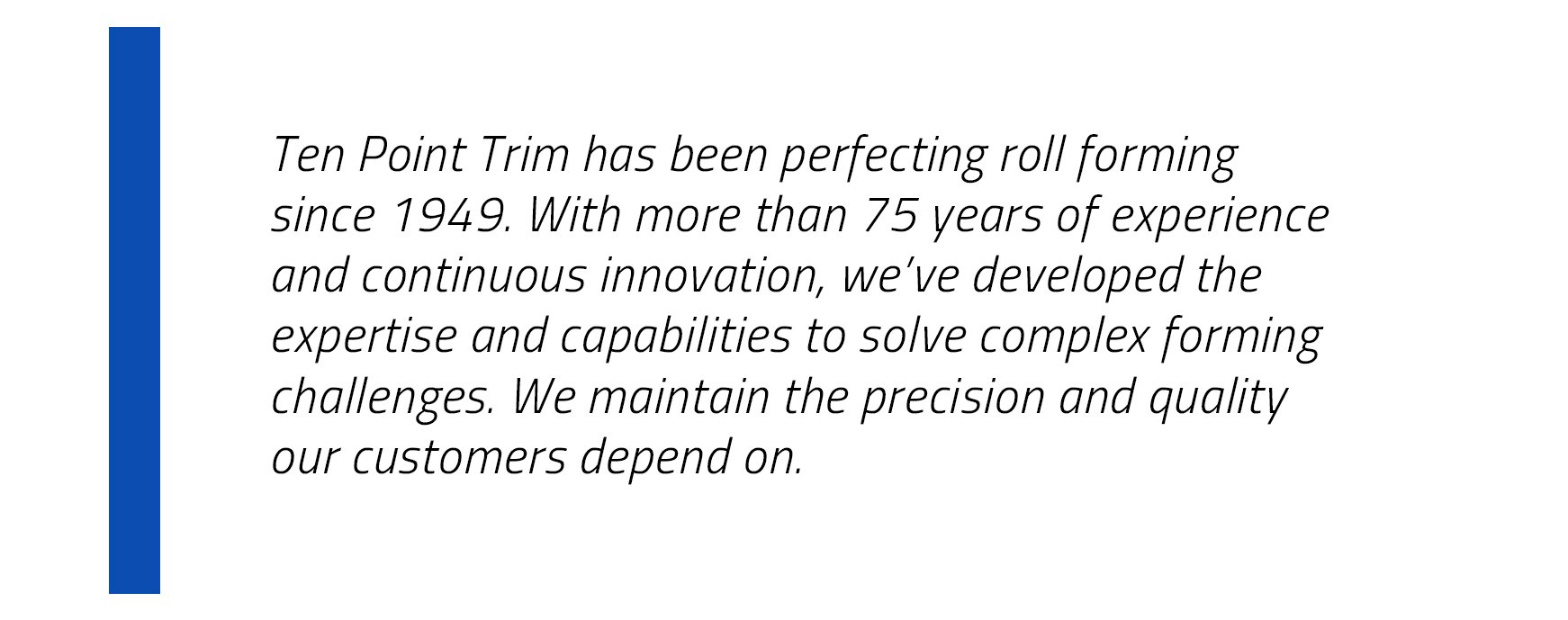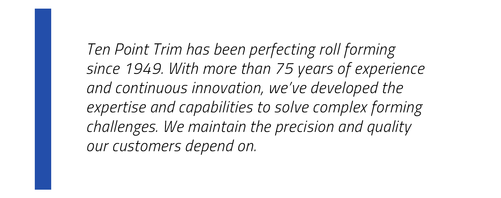 Ten Point Trim has been perfecting roll forming since 1949. With more than 75 years of experience and continuous innovation, we’ve developed the expertise and capabilities to solve complex forming challenges. We maintain the precision and quality our customers depend on.